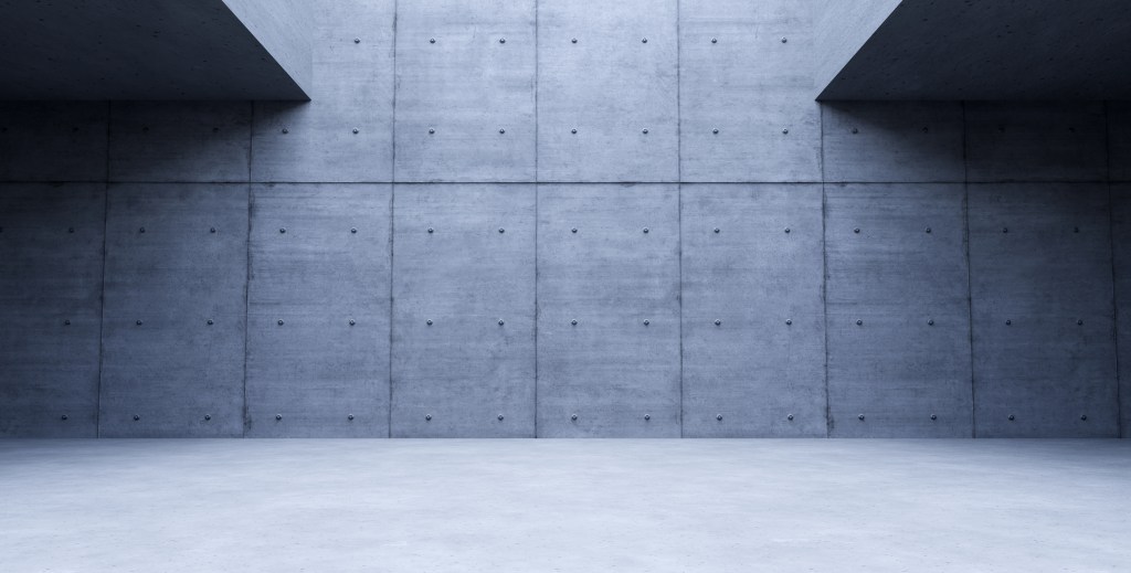 Empty, modern concrete walls hallway room with ceiling light in the back, 3D illustration