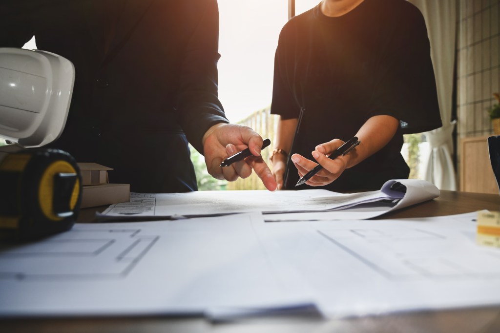 Two engineers in reflective vests working on blueprint and discussing the new project in office.